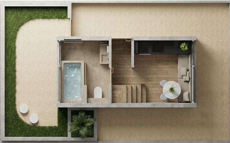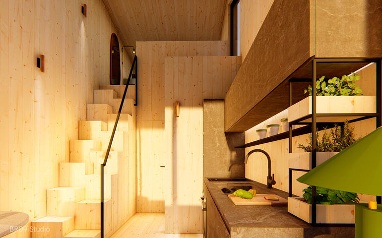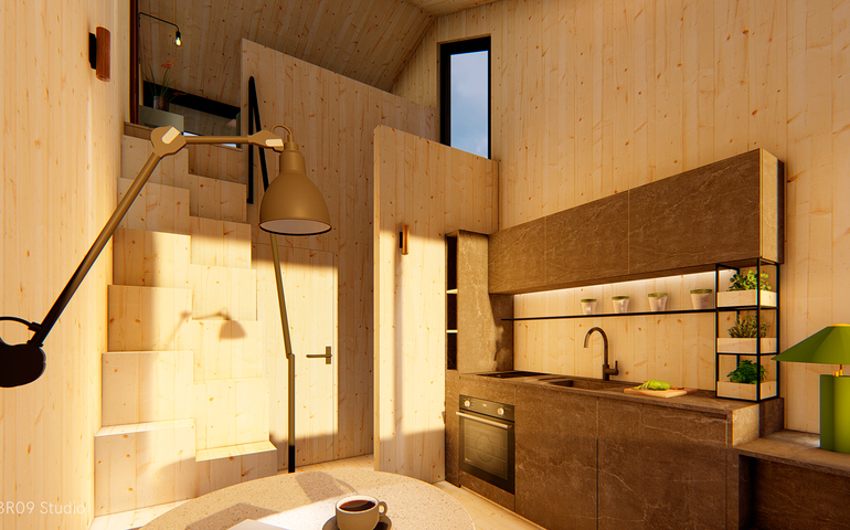 The layout optimizes every square meter through integrated storage solutions, a multifunctional staircase, and a sleeping mezzanine, creating a comfortable and well-balanced living experience within a minimal footprint.