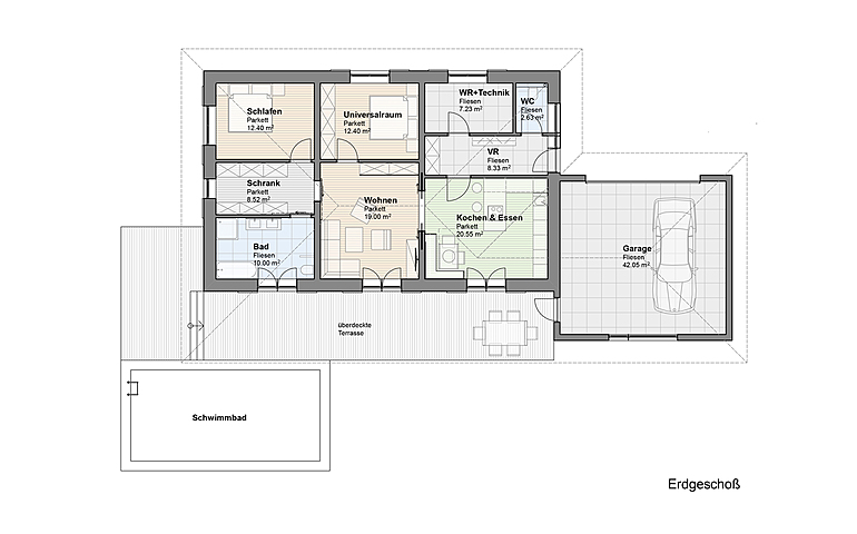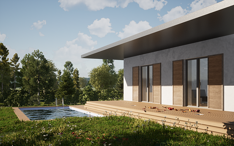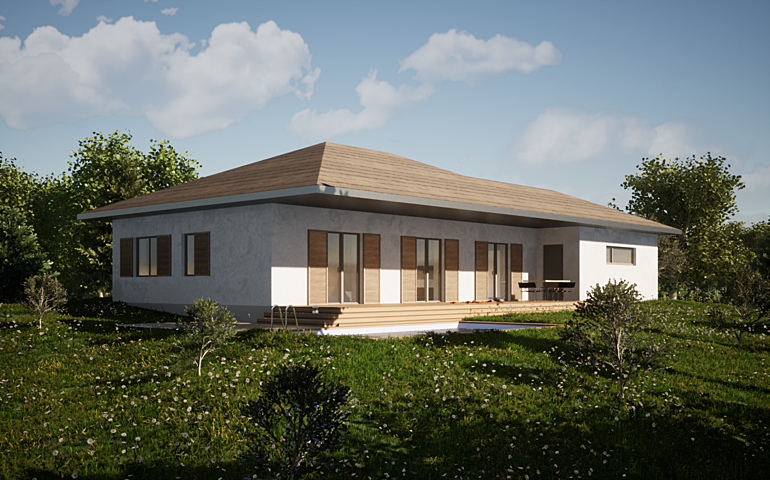 Der begehbarem Schrankraum und der Wirtschaftsraum bieten etwas überaus wichtiges in kleinen Gebäuden und zwar viel Stauraum. Eine großzügige Terrasse erstreckt sich über die gesamte Längsseite des Hauses und ist vom Koch- Essbereich vom Wohnzimmer und vom Badezimmer durch große Terrassentüren erreichbar.