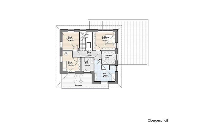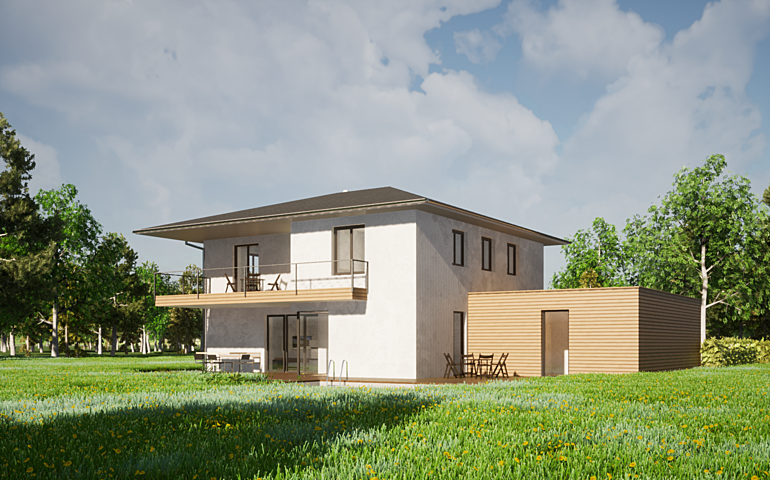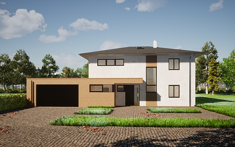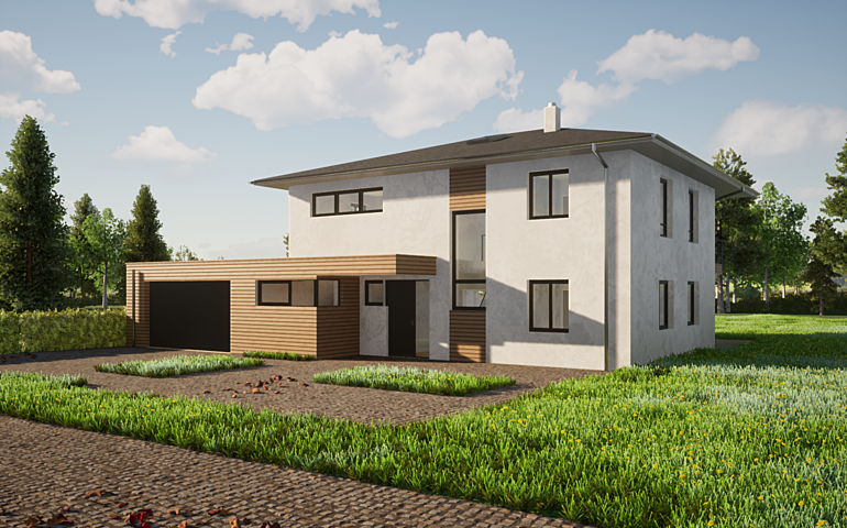 Durch eine Garderobe die auch als Windschleuse dient erreicht man eine großzügig gestaltete Wohn-Essküche mit viel Platz für eine Zusammenkunft mit Familie und Freunden. Vom Wohnzimmer und der Wohnküche erreicht man einen überdeckten Sitzbereich auf der Terrasse. Ein vom Wohnzimmer aus begehbarer Universalraum im Erdgeschoss kann als Büro oder Gästezimmer verwendet werden. Die Doppelgarage ist mit dem Haupthaus verbunden. Im Obergeschoss Befinden sich 2 Schlafräume für Kinder. Das Elternschlafzimmer direkt neben einem begehbaren Schrankraum angeordnet. Das gemeinschaftsbadezimmer ist überaus großzügig mit Badewanne und Dusche gestaltet. Ein Wirtschaftsraum im Obergeschoss erleichtert die Hausarbeit.