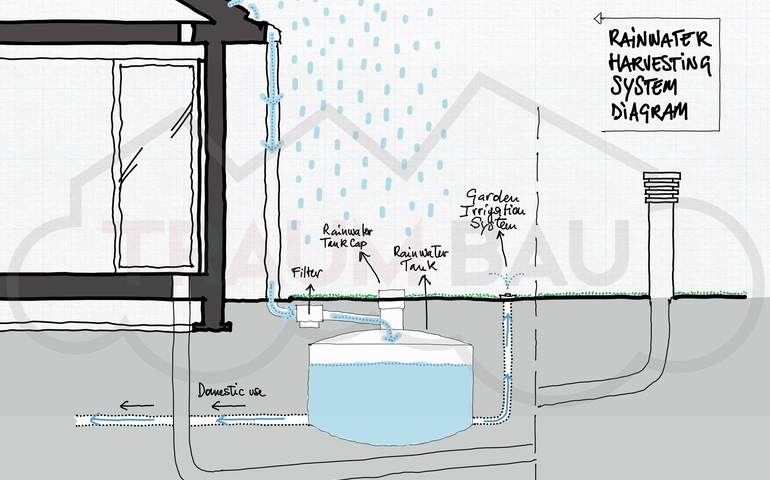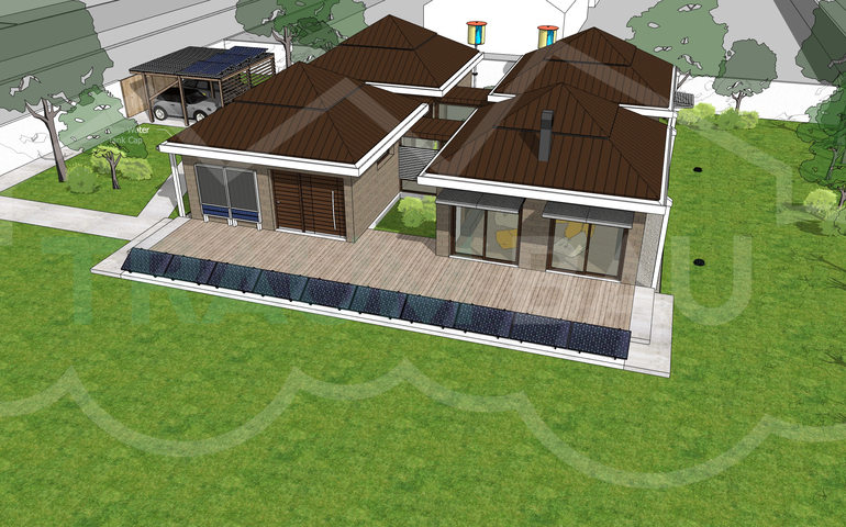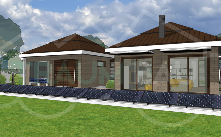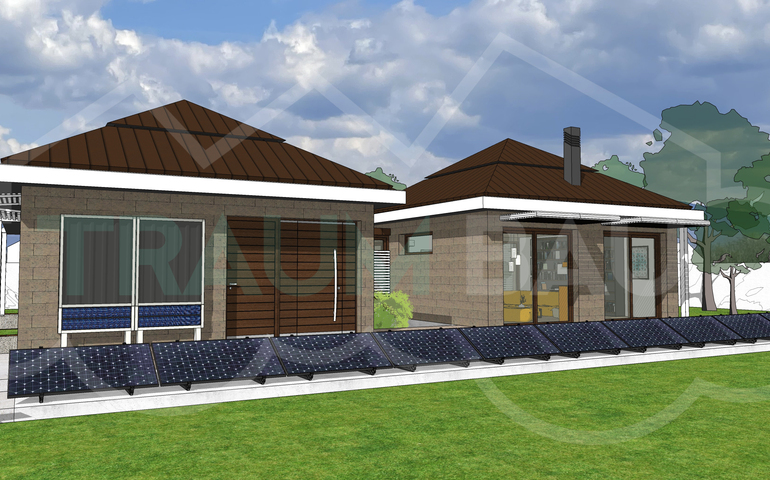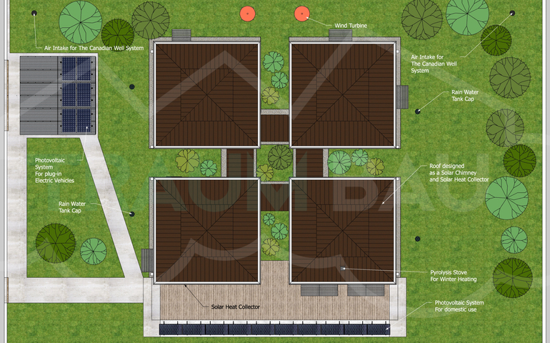 Solar panels, wind turbines, rainwater collection tanks, external heat accumulators and a pyrolysis stove complete the technical equipment of the house.
