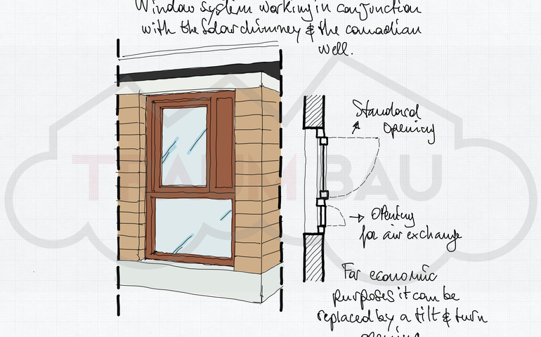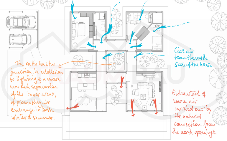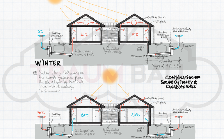 With a height of the internal rooms of the modules of 2.55 meters to contain the heat inside them, they are topped by a roof with traditionally built beams, designed with the aim of accumulating heat in winter and functioning as a solar chimney in summer; all governed by the convective motions created thanks to the contribution of the canals of the Canadian wells, located in the cooler northern external part of the plot where the building stands.