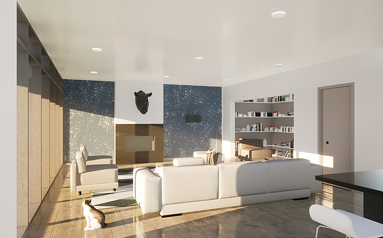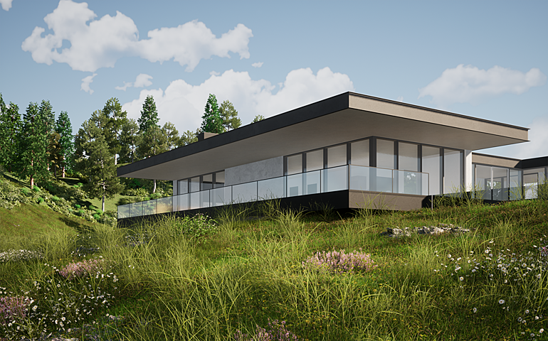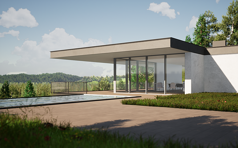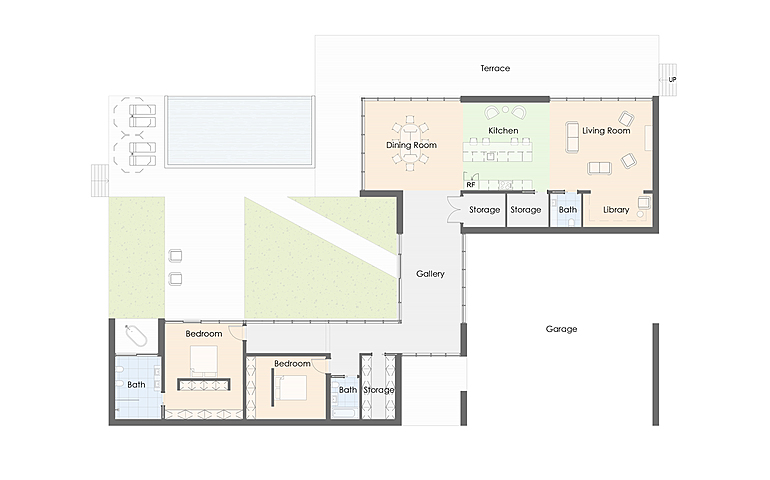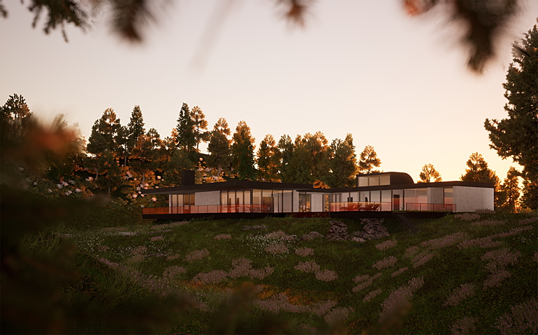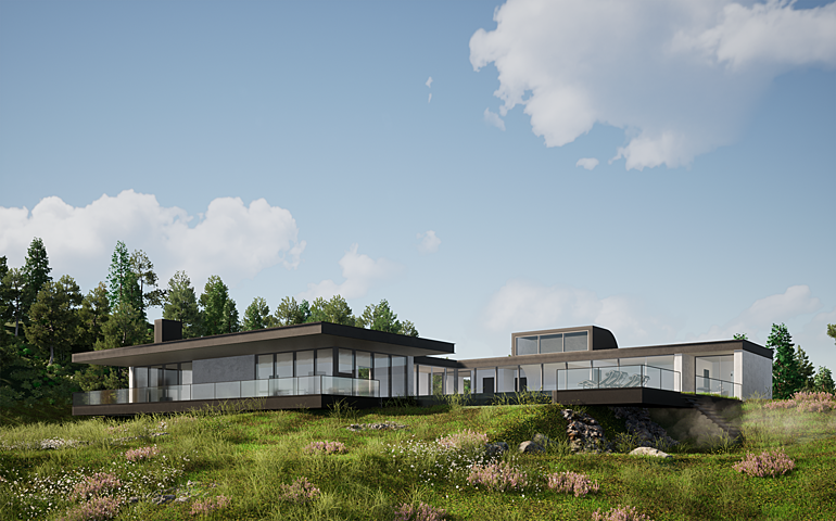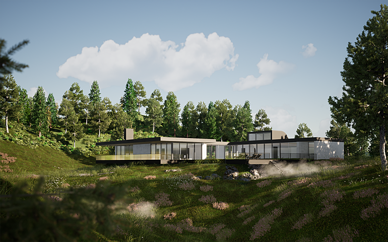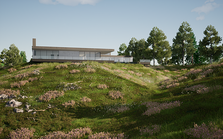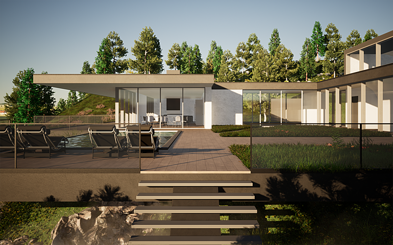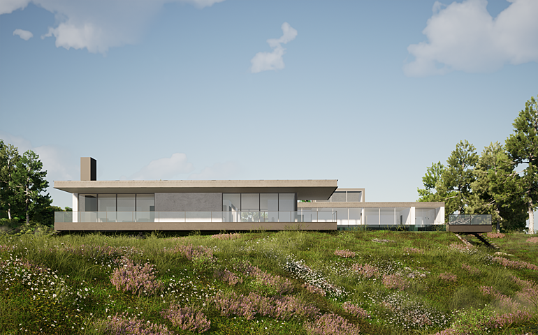 S-House is an opened-plan house designed to be a simple and spacious home for a single-family. The main spaces and shapes stay aside from visitors, letting the natural light and environment come through the building and connect the interior with nature. The master suite is huge and has its own bathroom with an open-air bathtub. The second bedroom has an upper skylight, which fills the room with the warm spread light.