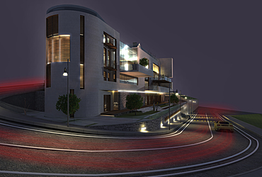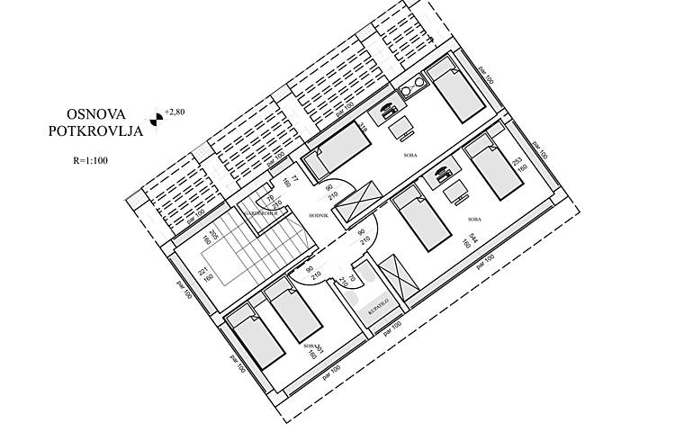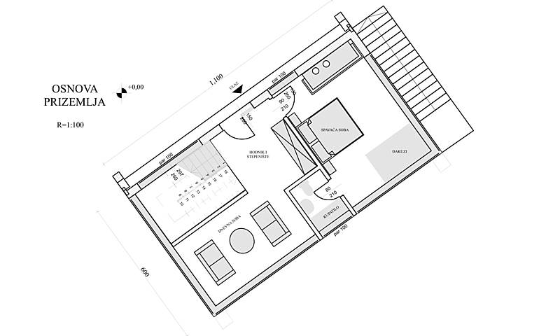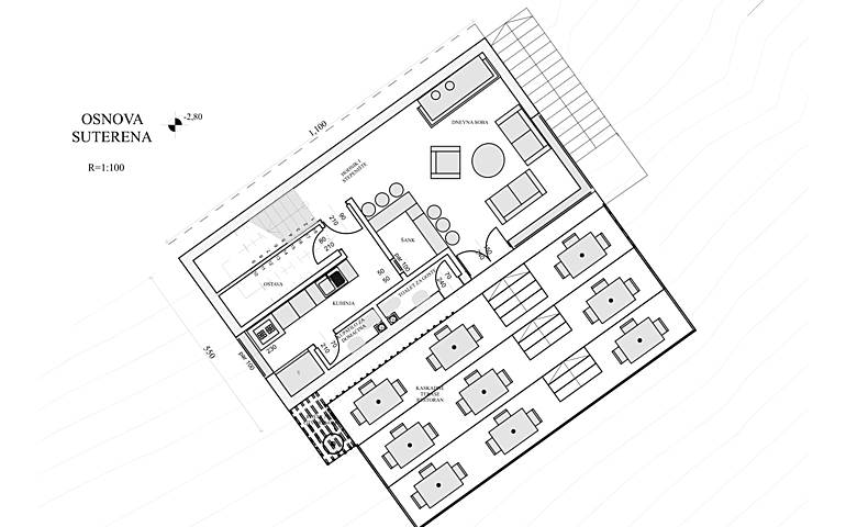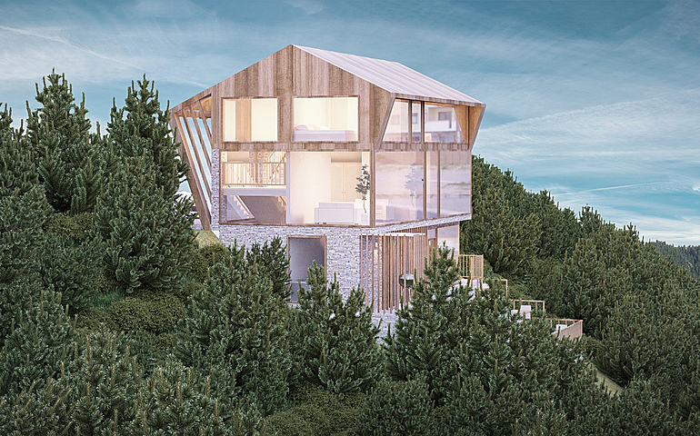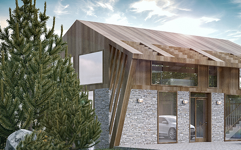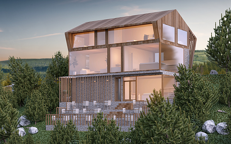 "House in the valley" is a house that is designed as a tourist offer for locations that have natural features. It was created for declining terrain and contains all the facilities that enable life in the building as well as business activities, mainly of a tourist nature.