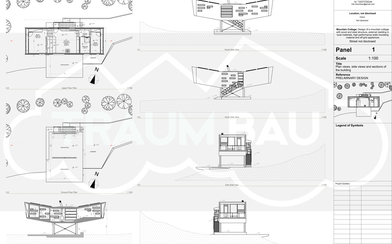 Design of a mountain cottage with wood and steel structure, external cladding in local materials, high performance walls insulating material and off grid appliances.
