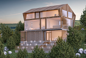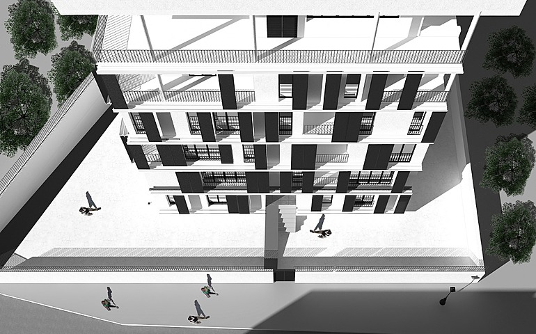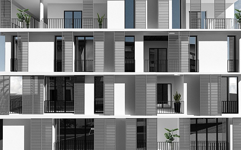 Inspiriert vom 50er-Jahre-Konzept der "Palazzina Romana", das sich auf hochwertige Mehrfamilienhäuser in Rom nach dem Zweiten Weltkrieg bezieht. Der Stil überprüft einige architektonische Parameter der 50er Jahre (wie die zentralen Eingänge, die Verwendung der Fensterläden) in eine zeitgemäße Verwendung (Schiebeläden im Gegensatz zum weißen minimalistischen Aspekt).