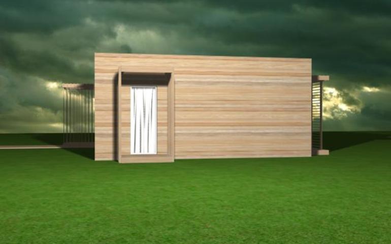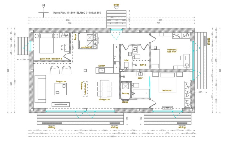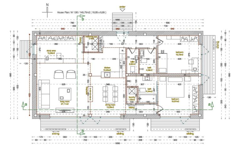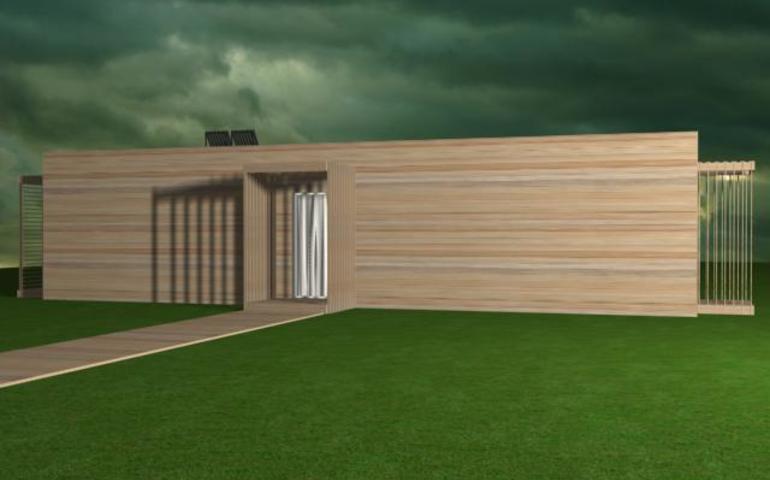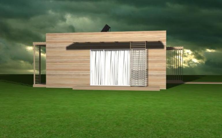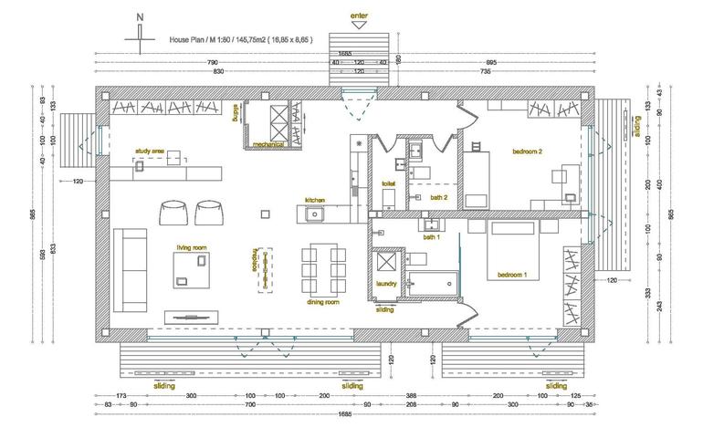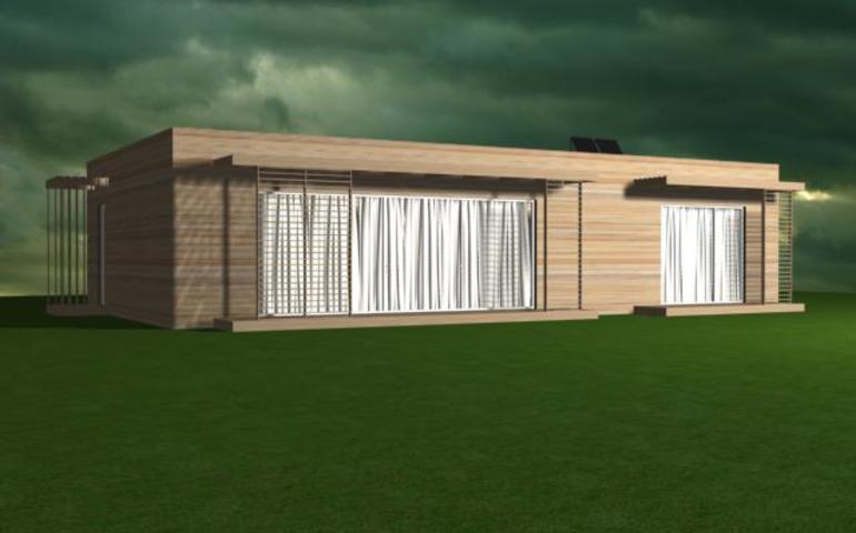 The architectural floor plan consists of day and night zone. Day zone include kitchen, dining room, living room with fireplace, study area, toilet, laundry, mechanical room. Night zone include master bedroom, master bathroom with toilet, douche and bath tub, second bedroom and second bathroom. As a 2nd variant of architectural layout study area can be changed in 3th bedroom, which can be used as a guest room or 2nd kids room / more practical Architectural Floor Plan /. Master bedroom, together with kitchen, dining and living room have a south orientation, until second bedroom / kids room / is with east orientation. That gives a chance for a great sunlight through the day, and natural daylight at the evenings. Sliding wood panels at South and East facades keep rooms cooler through the summer season. Solar system on the roof supply house with hot water from the sun.