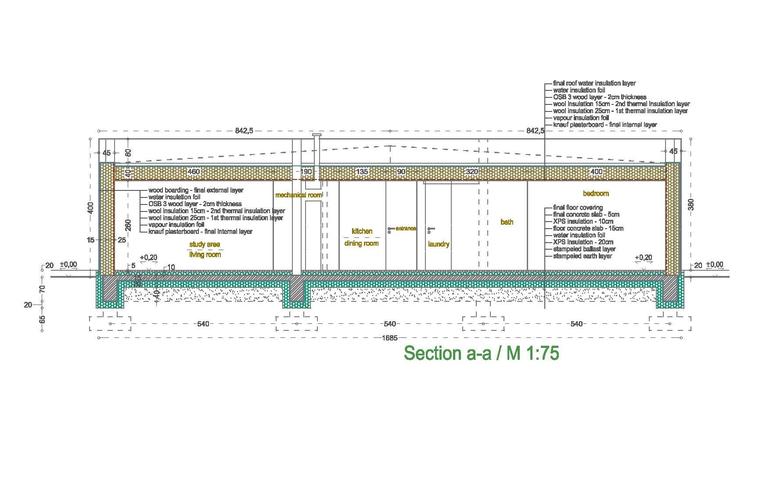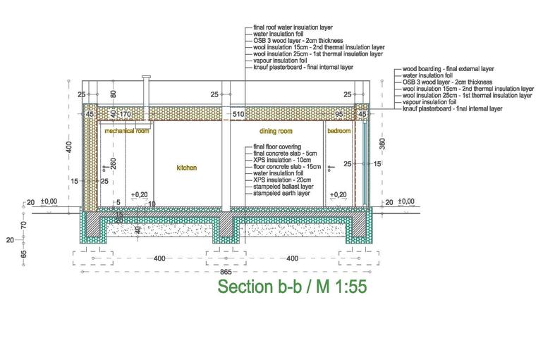 beams. Exterior walls are with light wood construction and 40cm wool thermal insulation. The final layer is composed with wood covering, which give a chance to use a prefabricated wood materials. The roof is also with wood( or steel ) construction and 40cm wool thermal insulation. One of the most important component of the house – windows, are with specific design