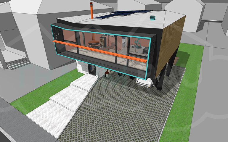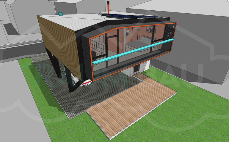 Technologically, it features sustainable and renewable energy devices and solutions like integrated solar panels, a photovoltaic system and the use of the natural ventilation for an almost complete off-grid experience.