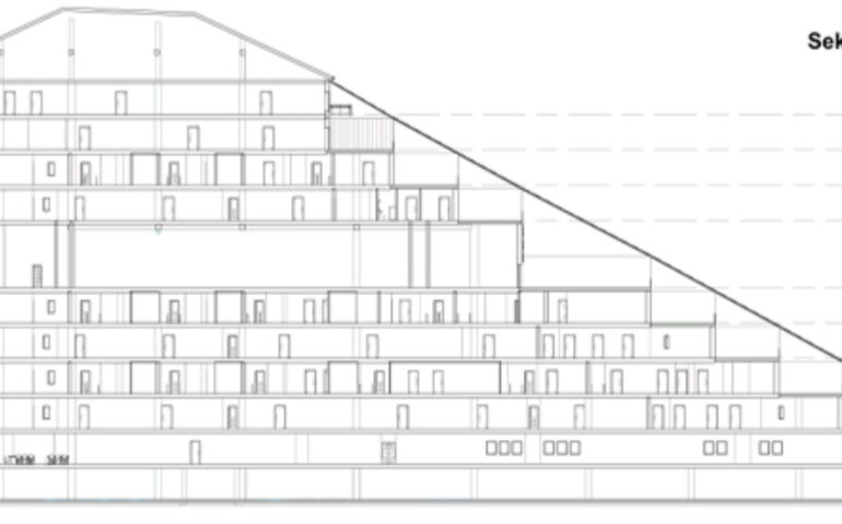 The total gross area of the building is 1.67 hectares (16 700 sqm.). It has 68 apartments with an average area of 117.4 m² per apartment and space for approximately 204 residents. The building is constructed with a concrete column system that follows the shape of the building and with external walls, beams and roof trusses in glulam. The facade is clad with vertical birch panels and horizontal teak panels on the 6th floor.
