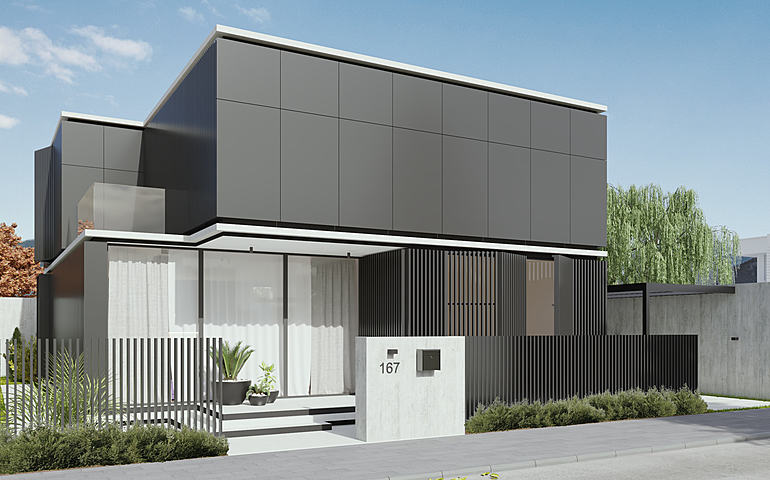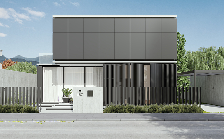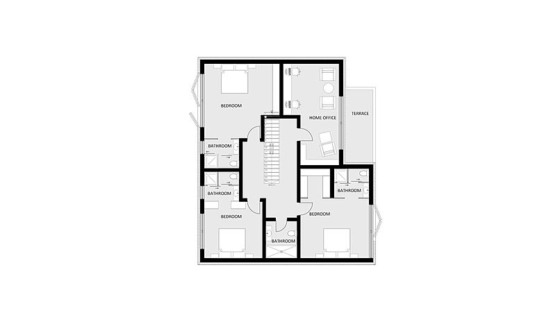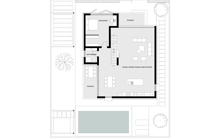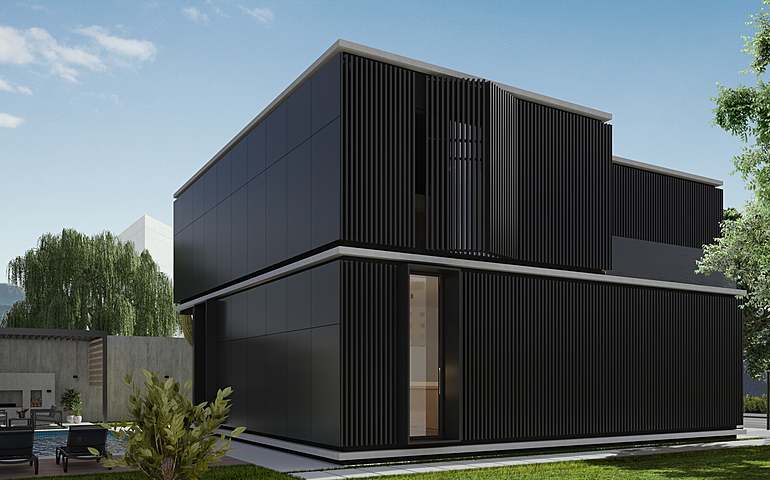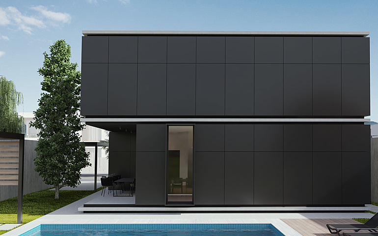 BlackHouse is a minimalistic residential house with an open plan concept. In the ground floor are located the living room, dining and kitchen, bathroom and one bedroom. In the second floor there are three master bedrooms, one shared bathroom and a home office. The facade is covered in black and can be partially open creating different atmospheres in the interior spaces.