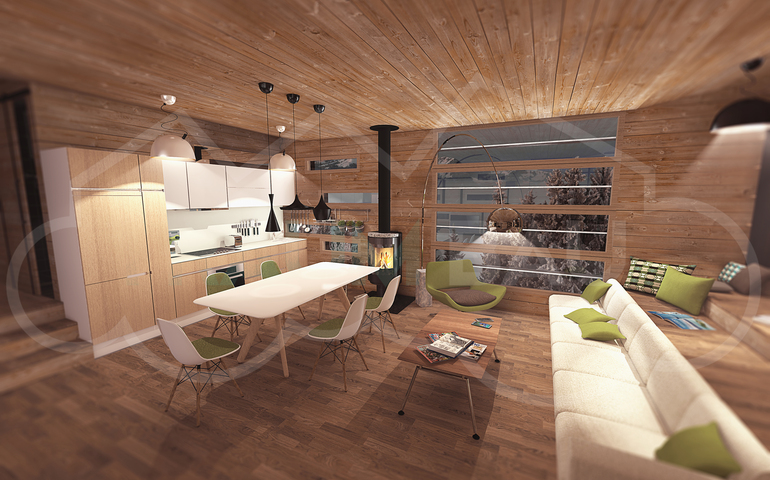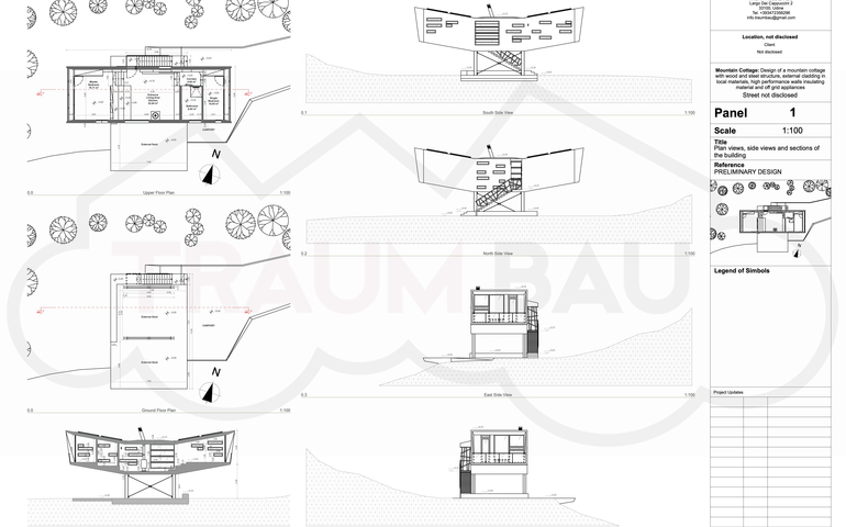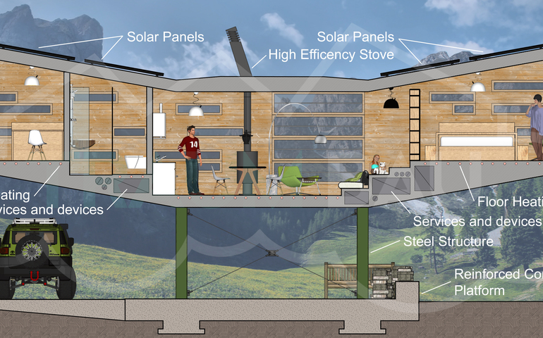 Design of a mountain cottage with wood and steel structure, external cladding in local materials, high performance walls insulating material and off grid appliances.