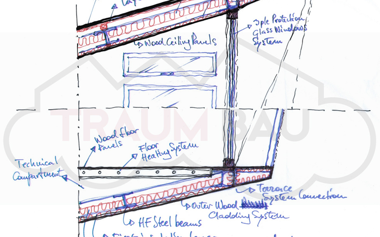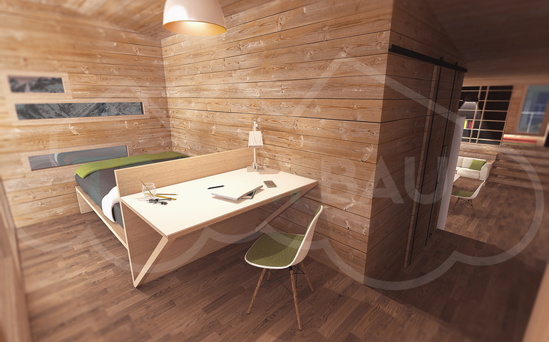 The structure is provided with steel beams for the skeleton and self-supporting wood panels for the outer shell. Local materials are used fo the external cladding and the interior walls finish.