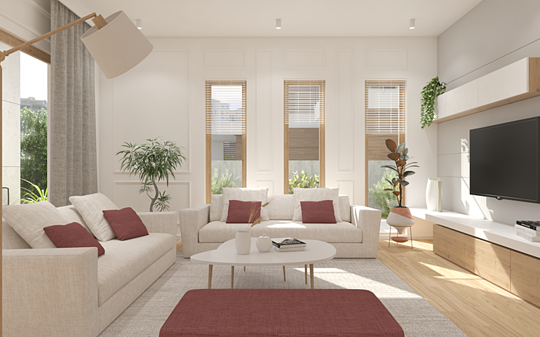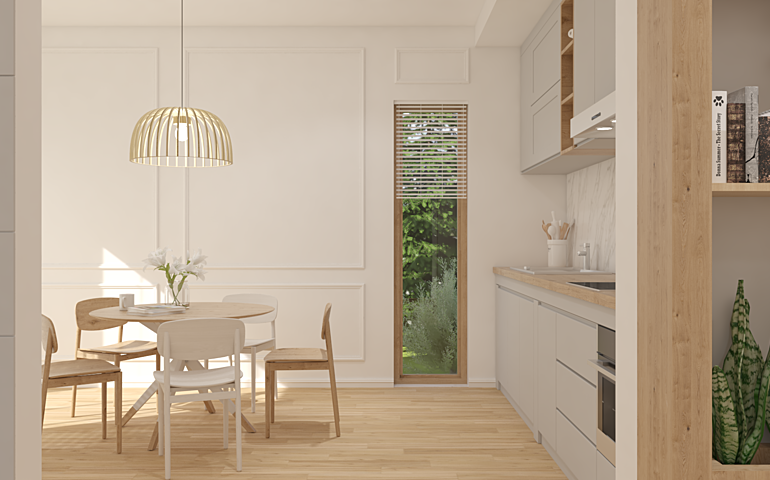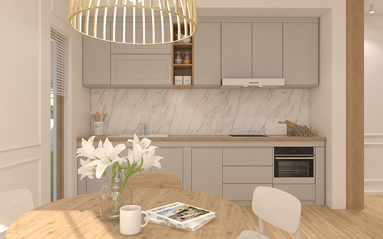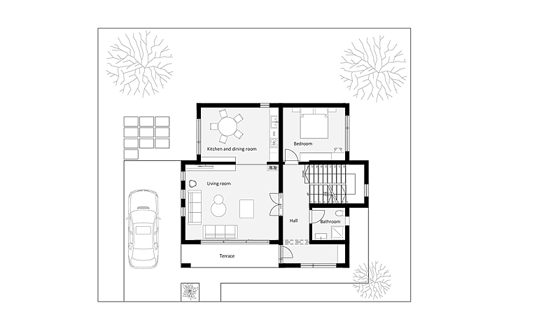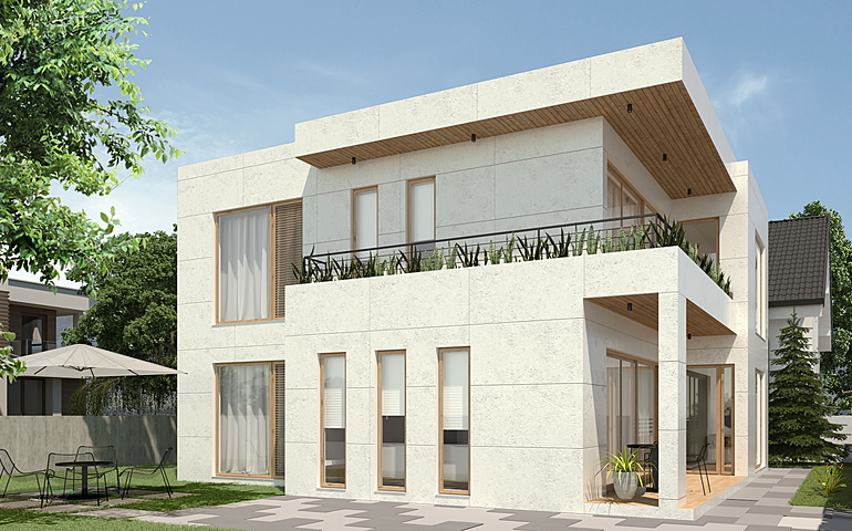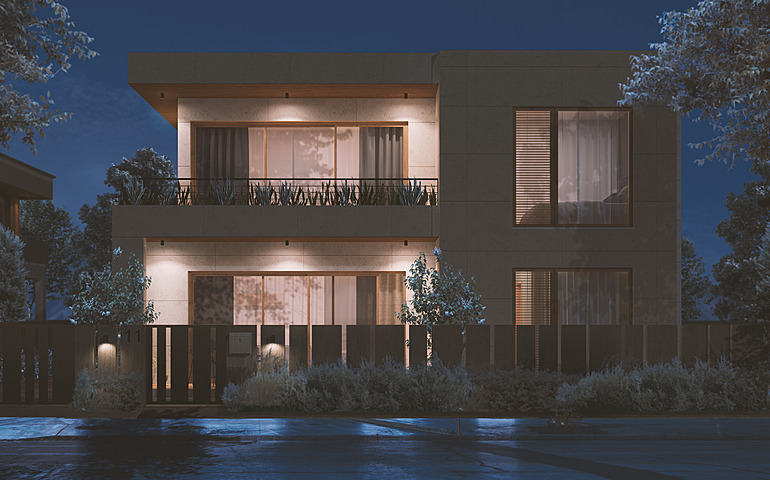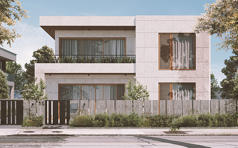 The travertine house is a compact house that contains all the necessary spaces for a comfortable living of a family of five to six members. The living room, kitchen and dining area, bathroom and one bedroom are located on the ground floor. The first floor contains private spaces; four bedrooms, one of which has a private bathroom, and a shared bathroom. The shape of the building is simple and the facade is materialized with travertine.